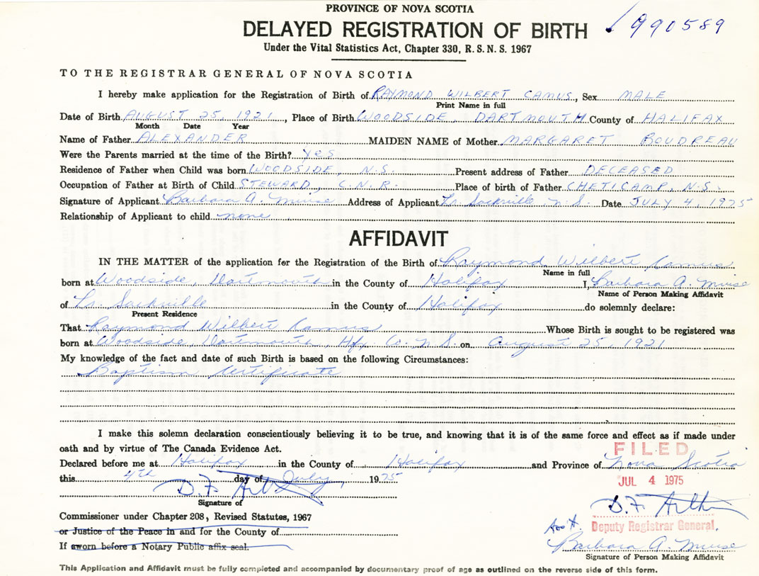 Date of Birth August 25, 1921 Place of Birth WoodsideCounty of Halifax