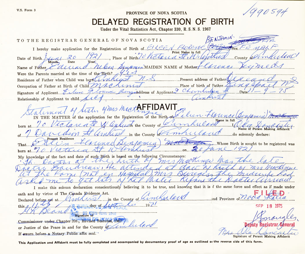 IN THE MATTER of the application for the Registration of the Birth of Eileen FlorenceBenjamin