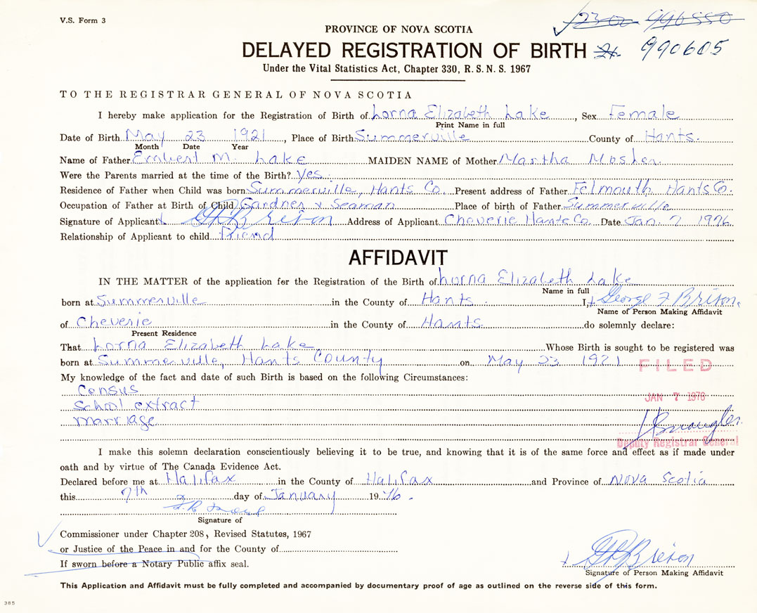 Date of Birth May 23, 1921 Place of Birth SummervilleCounty of Hants