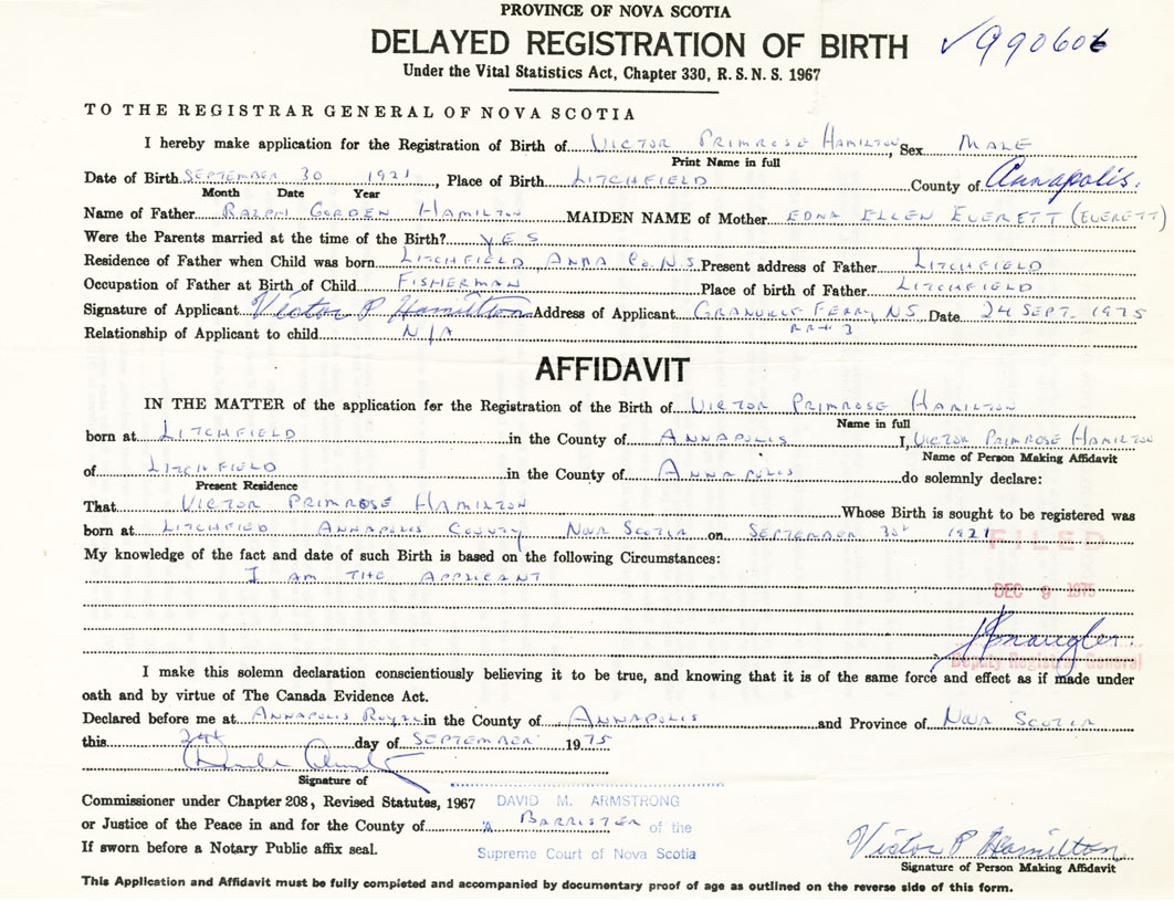 I hereby make application for the Registration of Birth of Victor PrimroseHamilton Sex Male