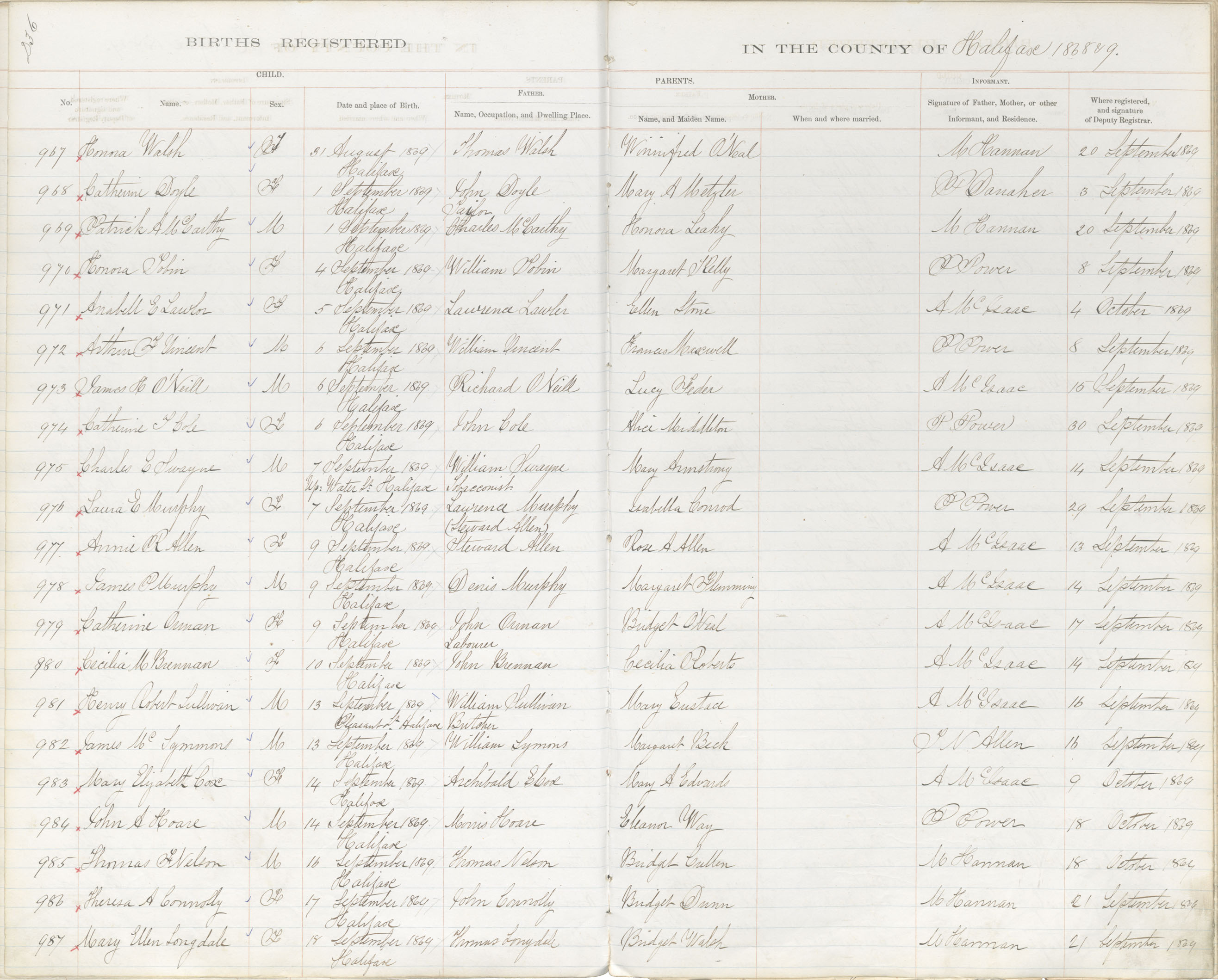 Birth Registration: Year: 1869 book: 1809 page: 236 number: 987