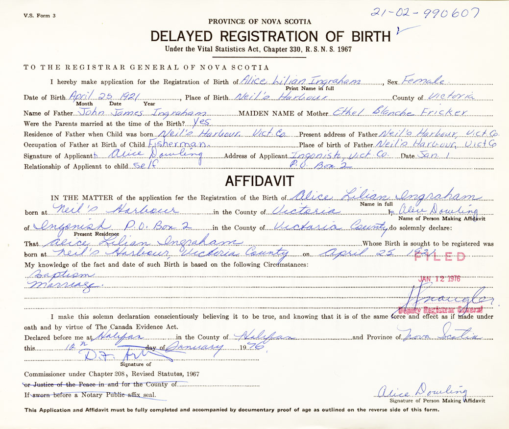 Signature of Applicant Alice Dowling Address of Applicant Ingonish Date January 1, 1976