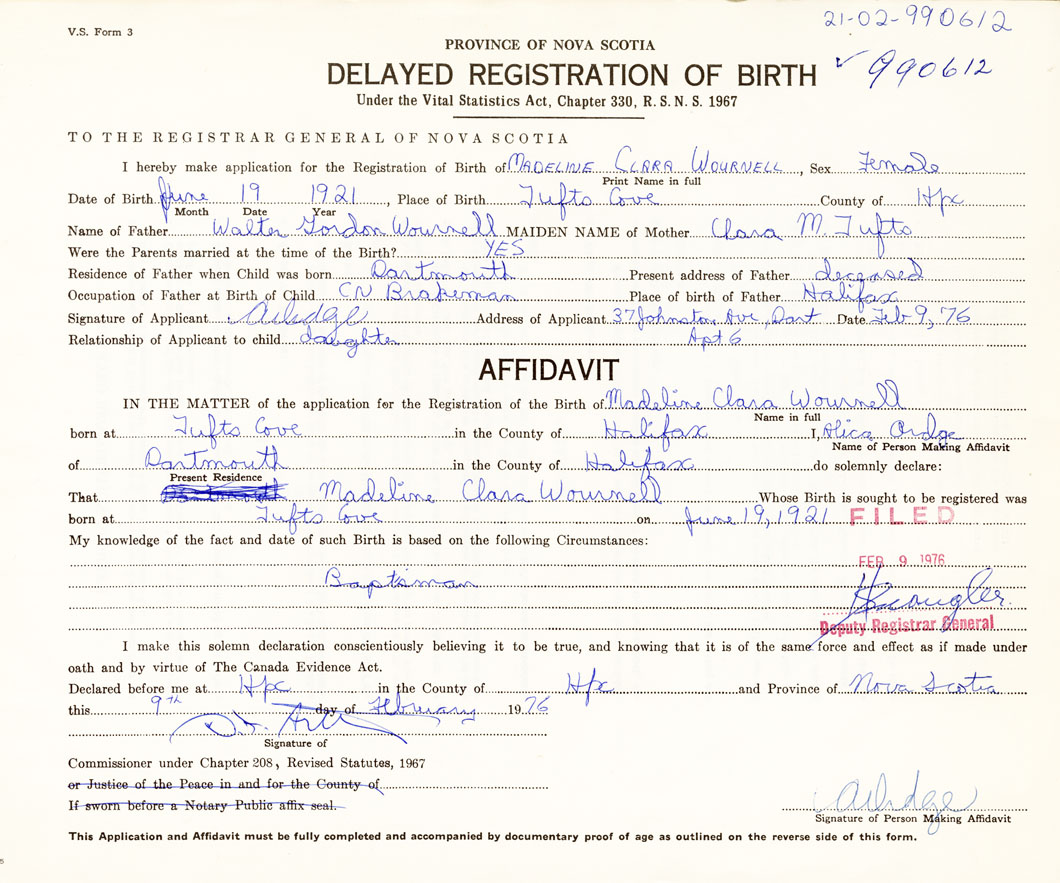 Date of Birth June 19, 1921 Place of Birth Tufts CoveCounty of Halifax