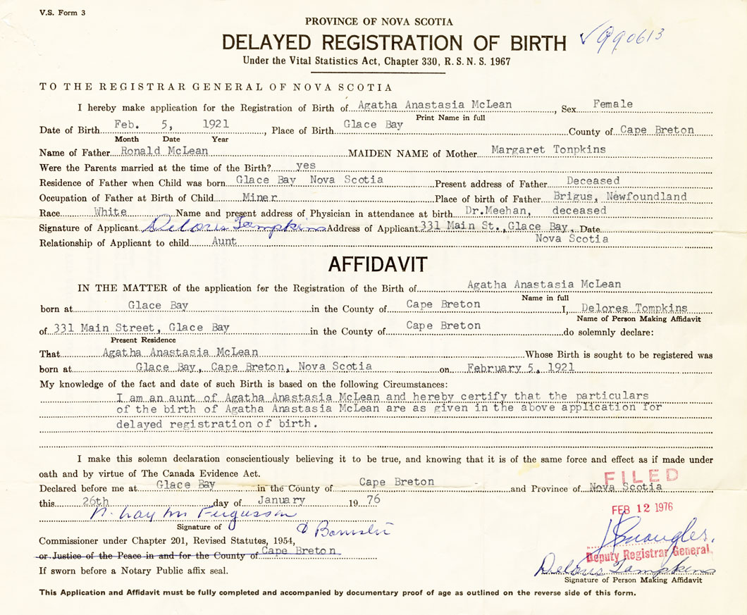 I am an aunt of Agatha Anastasia McLean and hereby certify that the particulars of the birth of Agatha Anastasia McLean are as given in the above application for delayed registration of birth.
