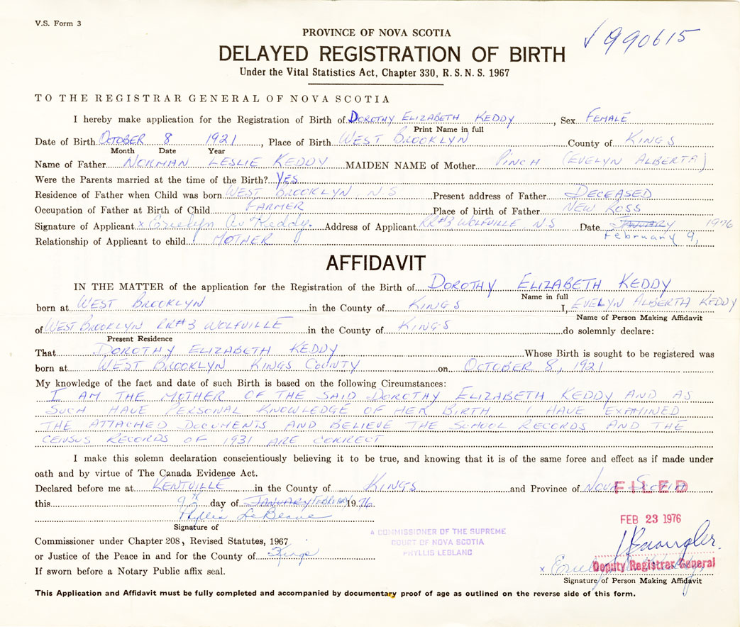 I am the mother of the said Dorothy Elizabeth Keddy and as such have personal knowledge of her birth. I have examined the attached documents and believe the school records and the census records of 1931 are correct.
