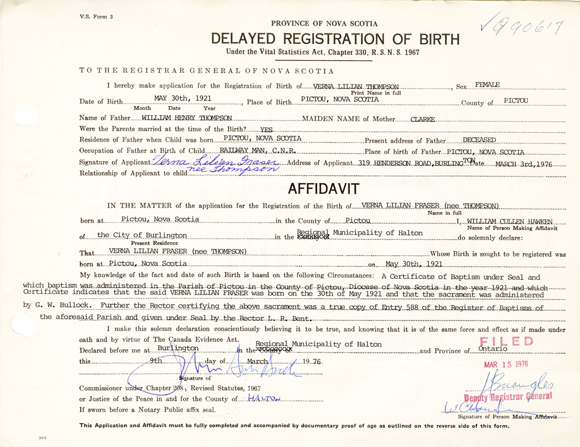 21. Name and Post Office address of Informant Verna Lilian Fraser 219 Henderson Road, Burlington, Ontario