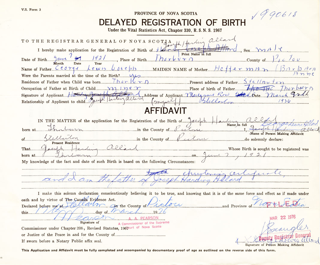 Signature of Applicant Joseph Harding Allard Address of Applicant Mulgrave Row, Stellarton Date March 9, 1976