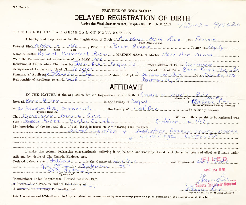 Date of Birth October 16, 1921 Place of Birth Bear RiverCounty of Digby