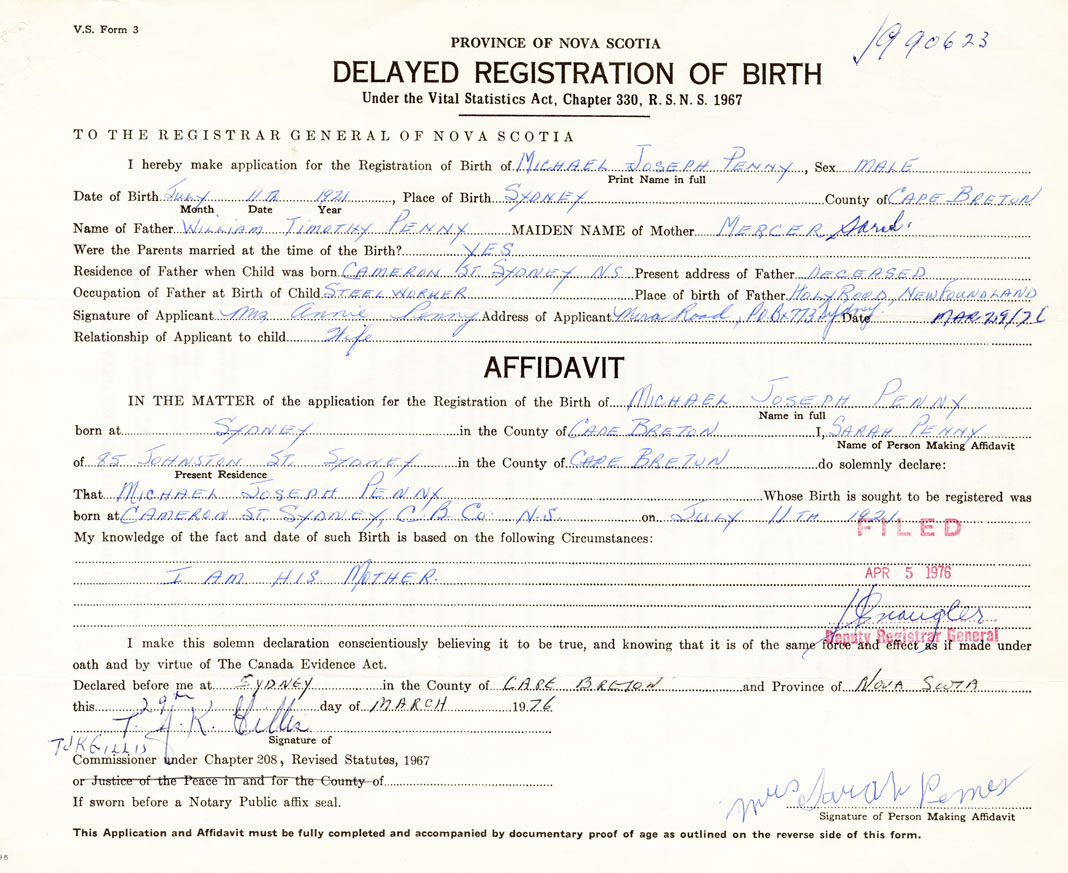 I hereby make application for the Registration of Birth of Michael JosephPenny Sex Male