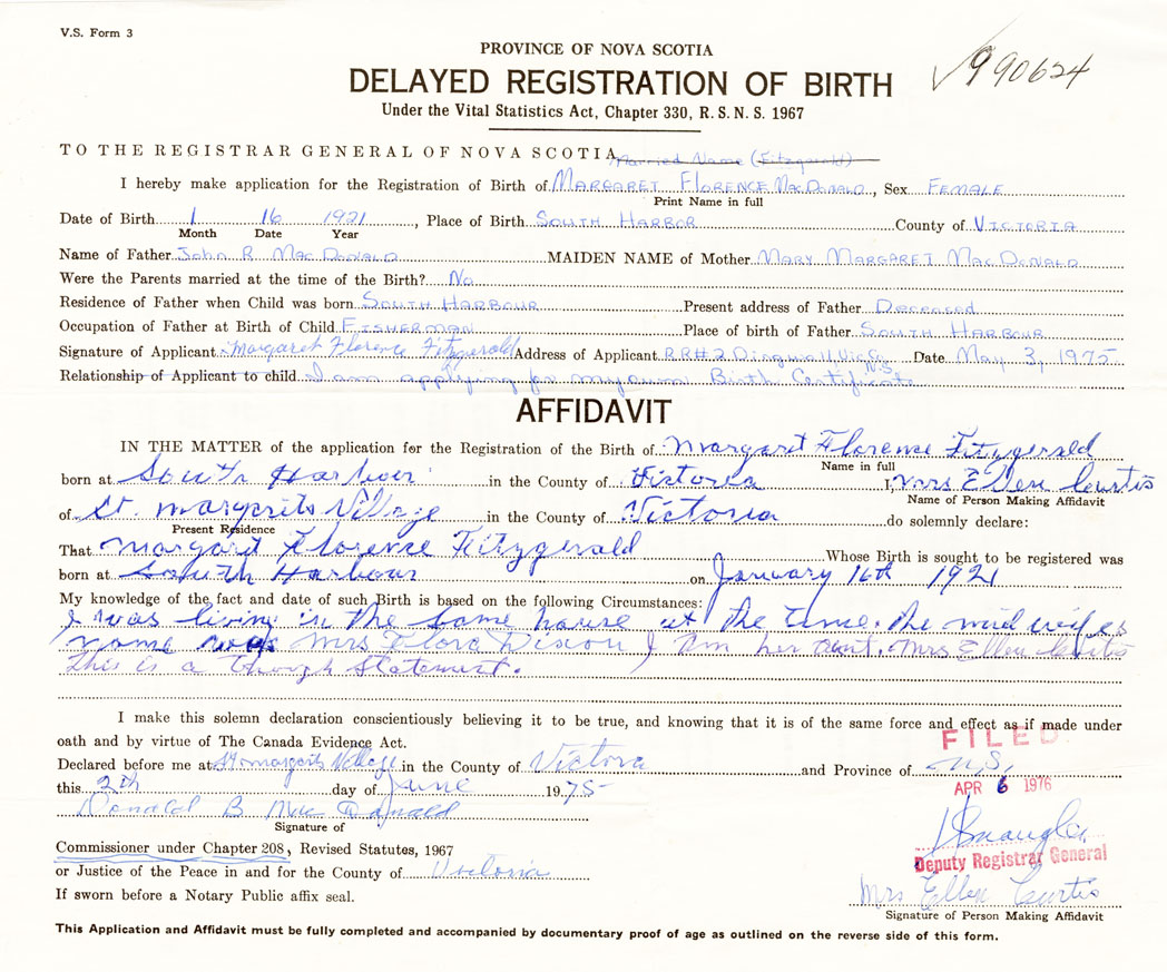 Signature of Applicant Margaret Florence Fitzgerald Address of Applicant RR2 Dingwall Date Mary 3, 1975