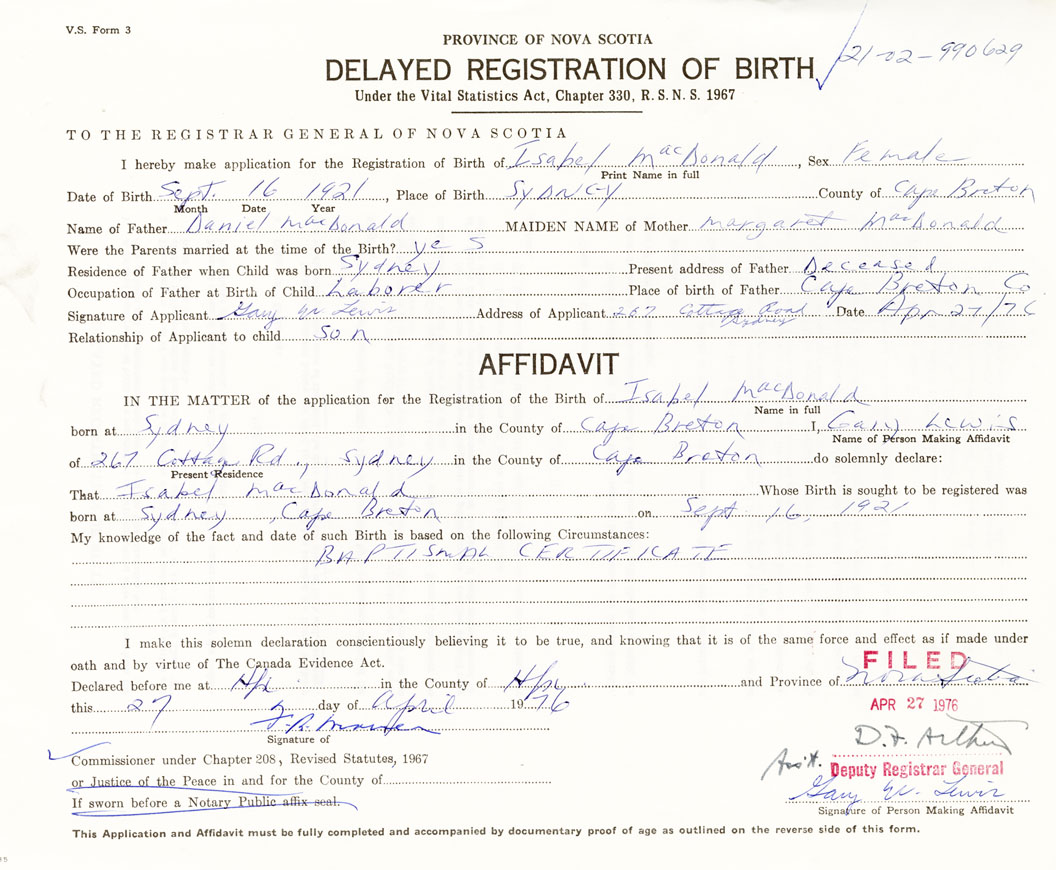 IN THE MATTER of the application for the Registration of the Birth of IsabelMacDonald