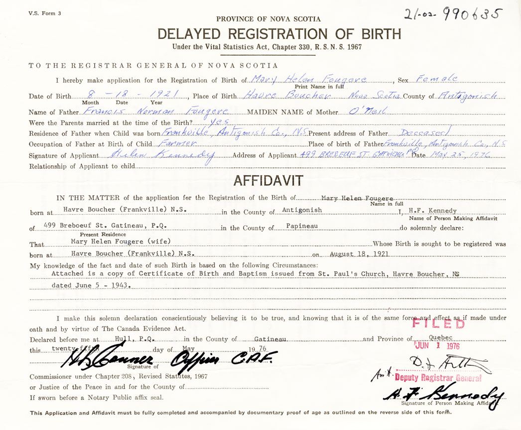 21. Name and Post Office address of Informant Helen Kennedy 499 Brebeuf St. Gatineau Quebec