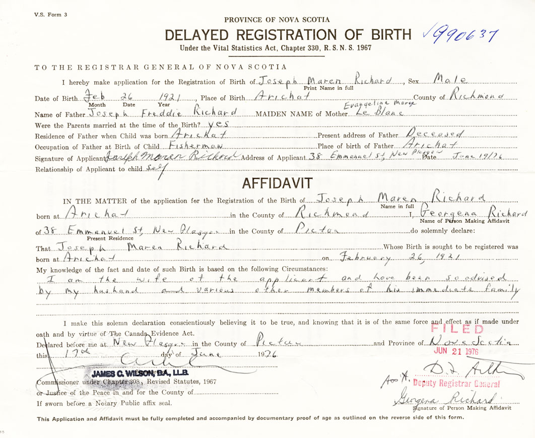 Date of Birth February 26, 1921 Place of Birth ArichatCounty of Richmond