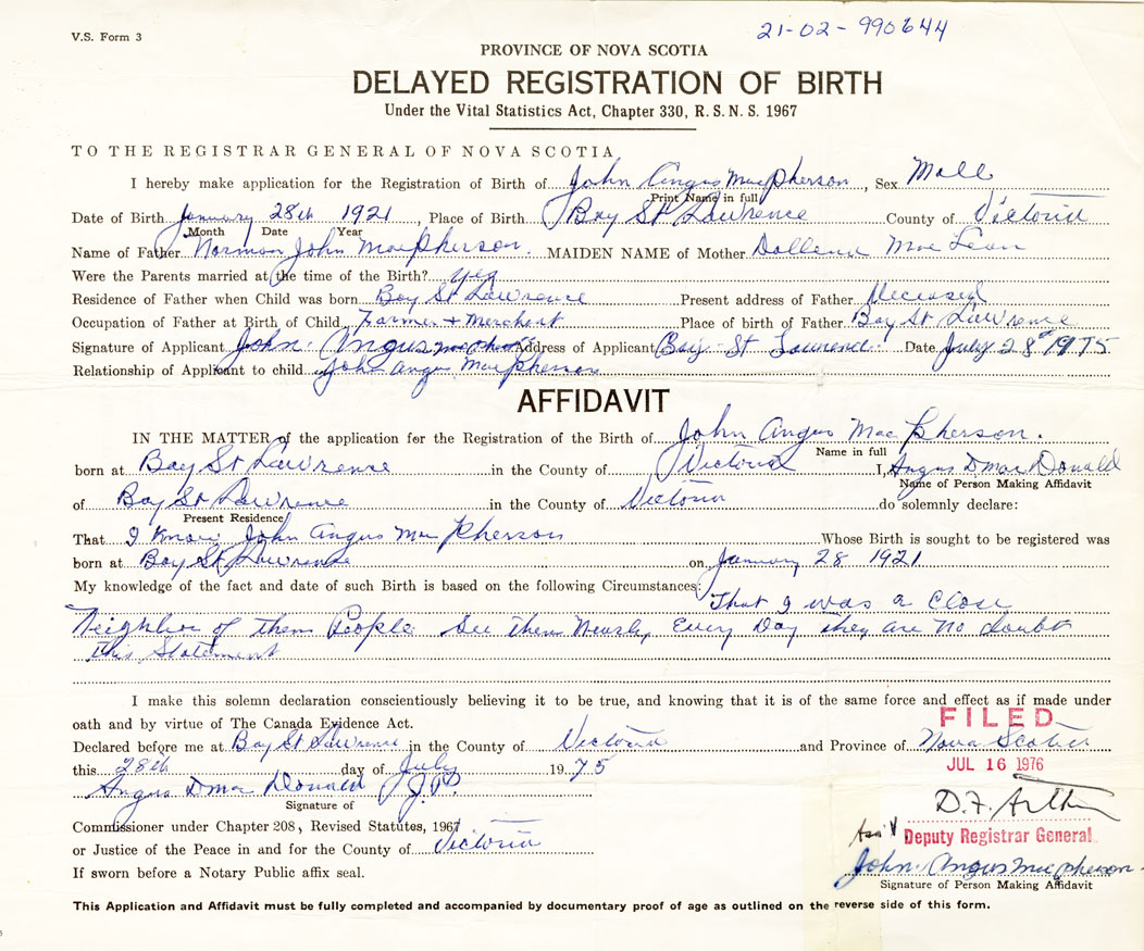 Signature of Applicant John Angus MacPherson Address of Applicant Bay St. Lawrence Date July 28, 1975