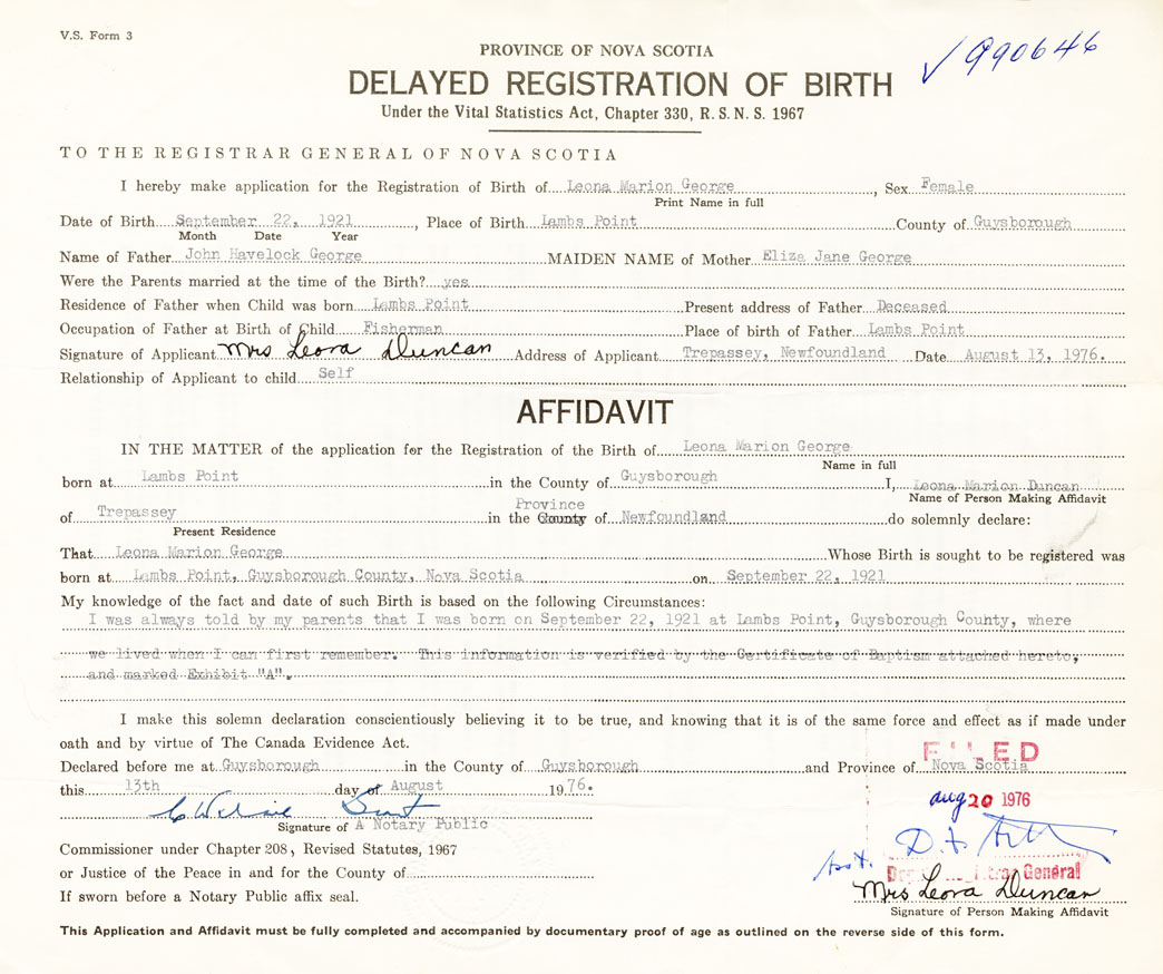 I was always told by my parents that I was born on September 22, 1921 at Lambs Point, Guysborough County, where we lived when I can first remember. This information is verified by the Certificate of Baptism attached hereto, and marked Exhibit "A".