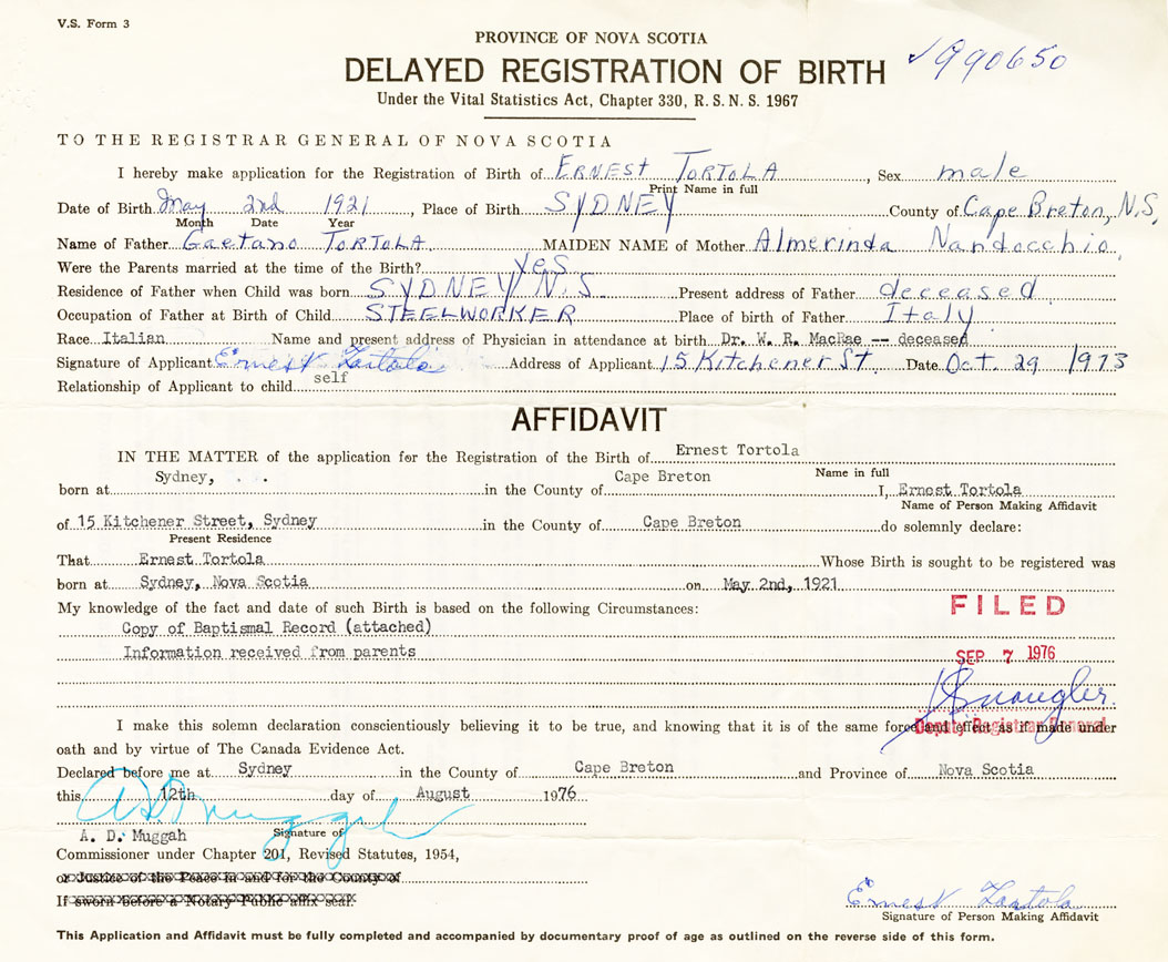 Name of Father Gaetane Tortola MAIDEN NAME of Mother Almerinda Nandocchio