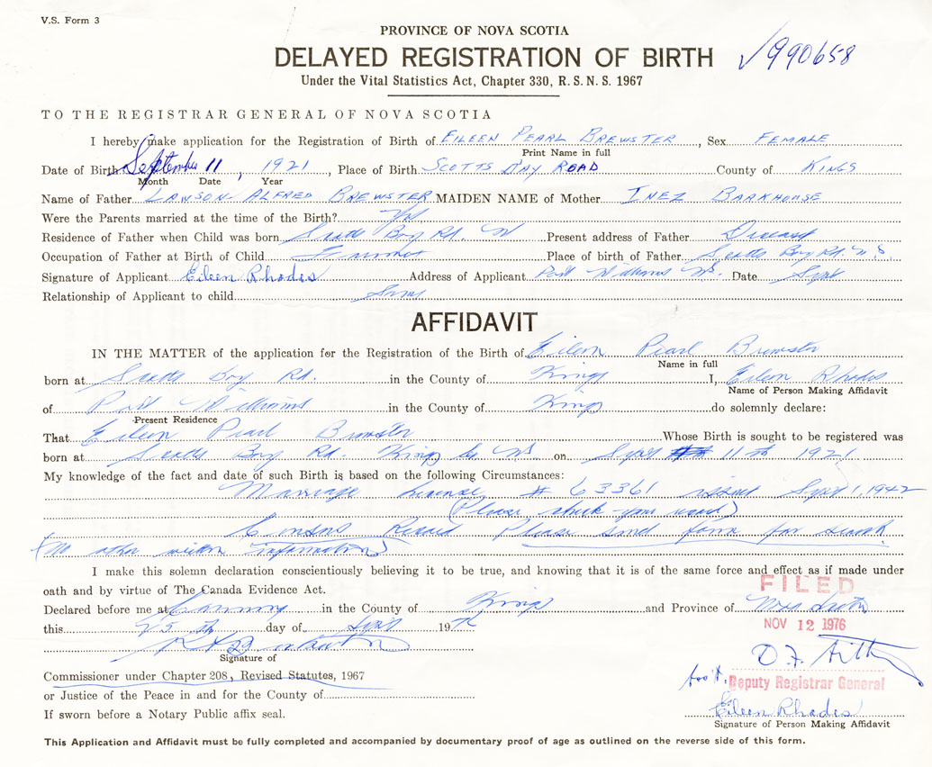 Signature of Applicant Eileen Rhodes Address of Applicant Port Williams Date September 1976