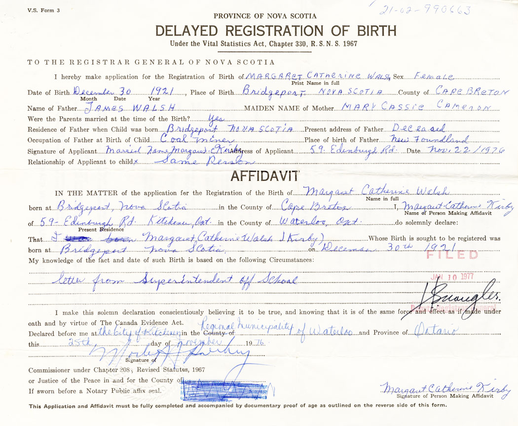 IN THE MATTER of the application for the Registration of the Birth of Margaret CatherineWalsh