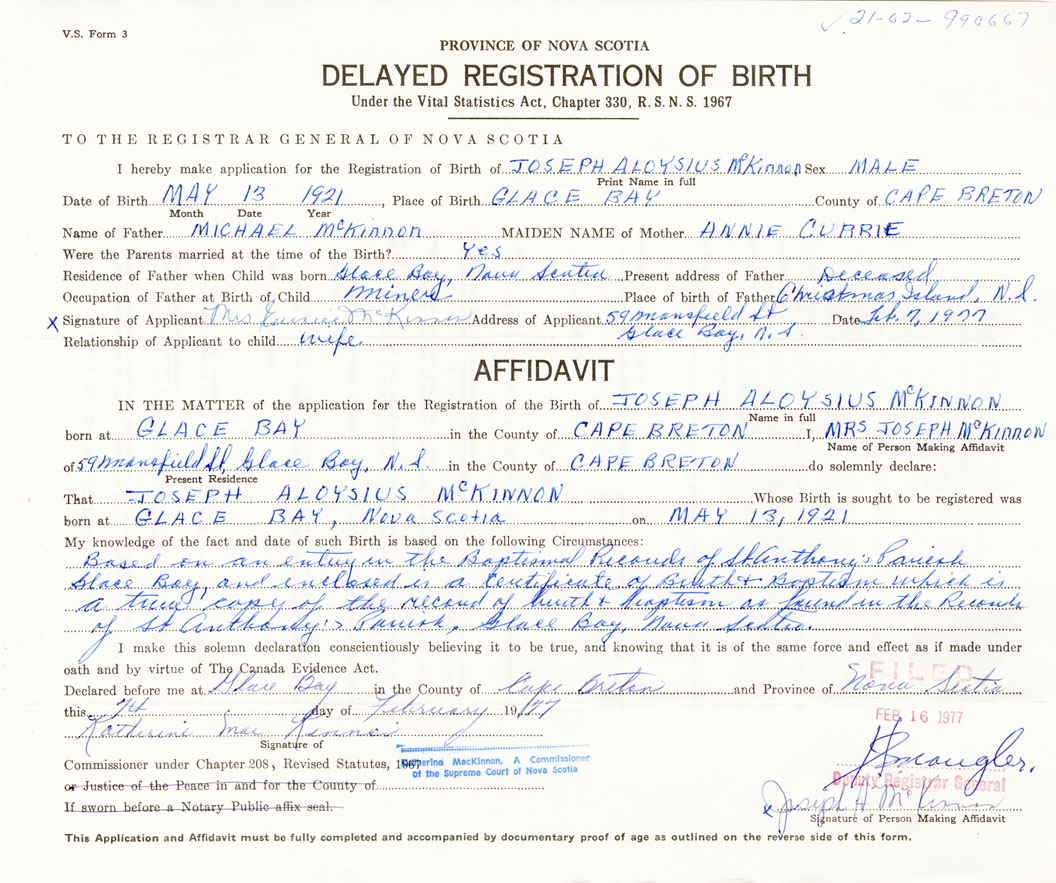 Based on an entry in the Baptismal Records of St. Anthonys Parish Glace Bay, and enclosed is a Certificate of Birth and Baptism which is a true copy of the record of birth and baptism as found in the Records of St. Anthonys Parish, Glace Bay.