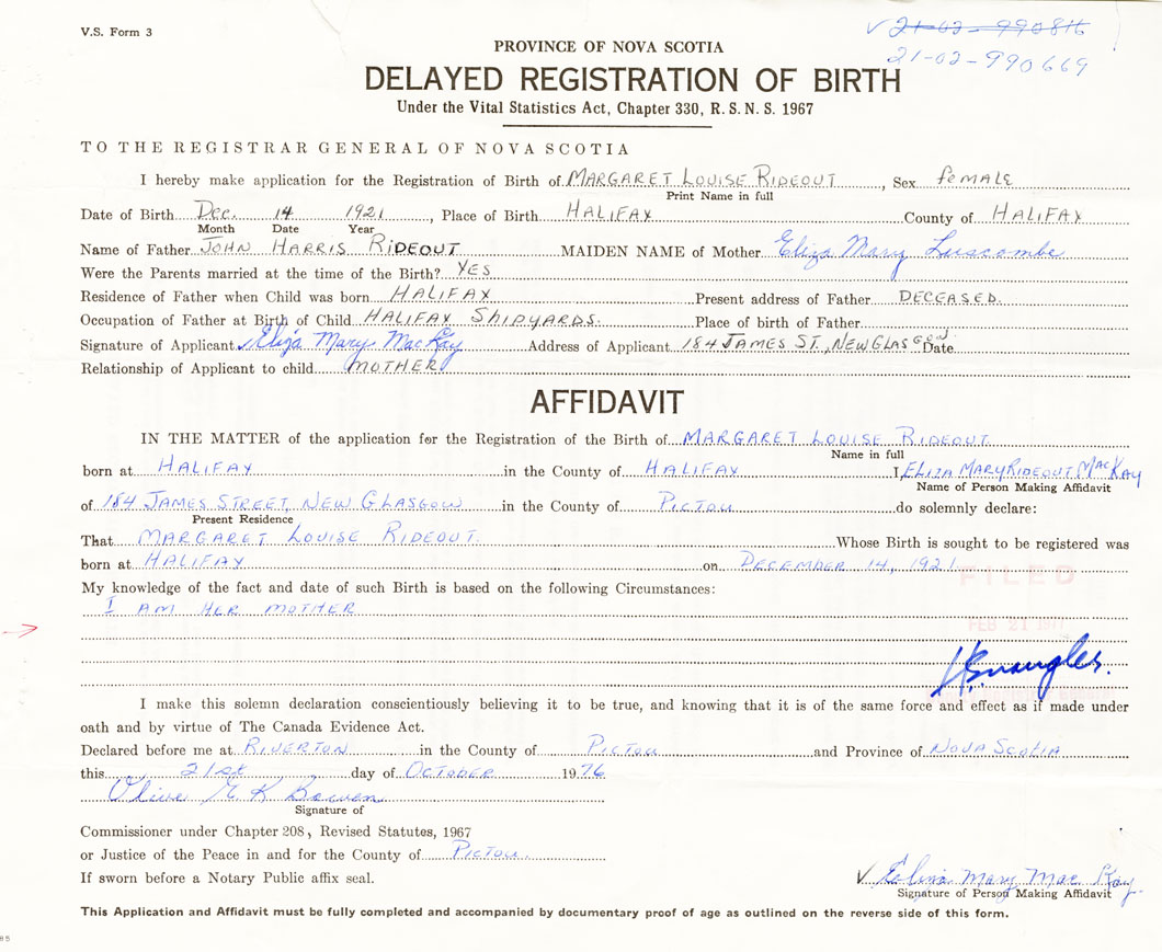 I hereby make application for the Registration of Birth of Margaret LouiseRideout Sex Female