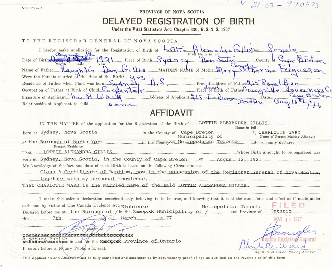 Class A Certificate of Baptism, now in the possession of the Registrar General of Nova Scotia, together with my personal knowledge. That Charlotte Ward is the married name of the said Lottie Alexandra Gillis.