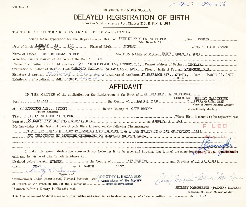 Signature of Applicant Shirley Marguerite MacLean Address of Applicant 27 Harrison Ave., Sydney Date March 22, 1977