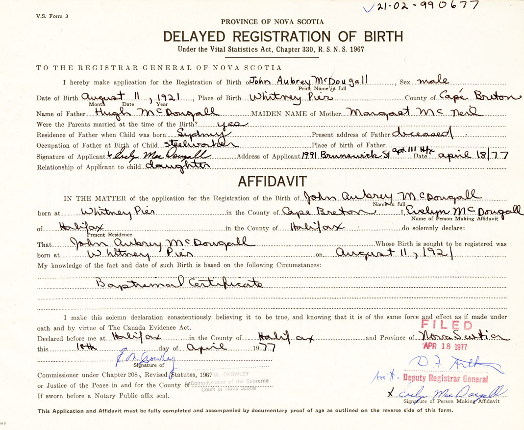 born at Whitney Pier Cape Breton County on August 11, 1921