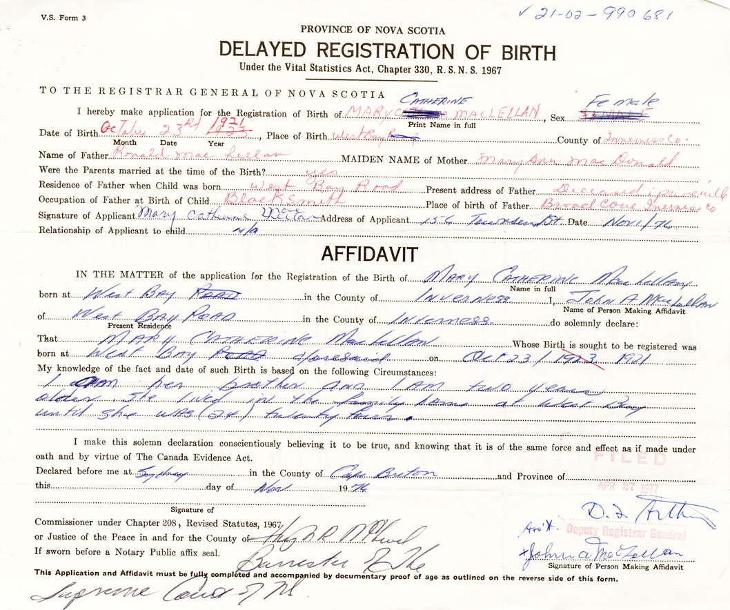 I hereby make application for the Registration of Birth of Mary CatherineMacLellan Sex Female