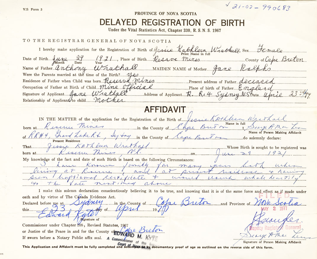 Date of Birth June 29, 1921 Place of Birth Reserve MinesCounty of Cape Breton