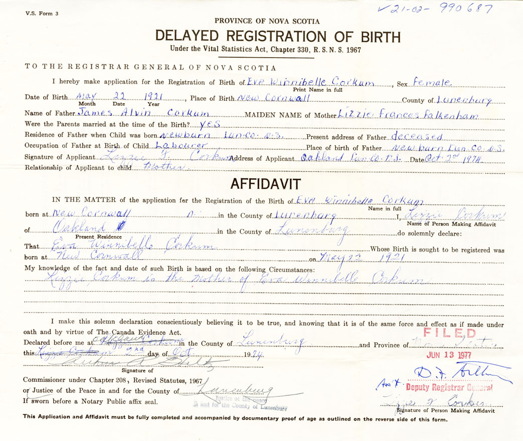 I hereby make application for the Registration of Birth of Eva WinnibelleCorkum Sex Female