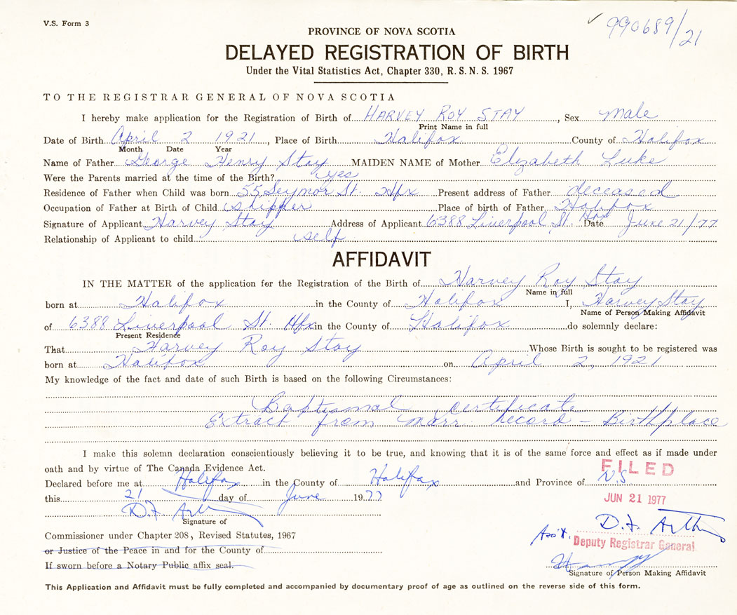 IN THE MATTER of the application for the Registration of the Birth of Harvey RoyStay