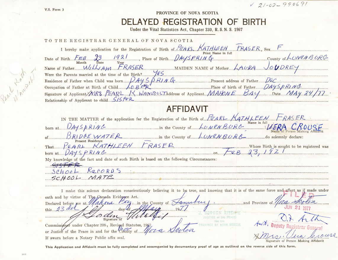 IN THE MATTER of the application for the Registration of the Birth of Pearl KathleenFraser
