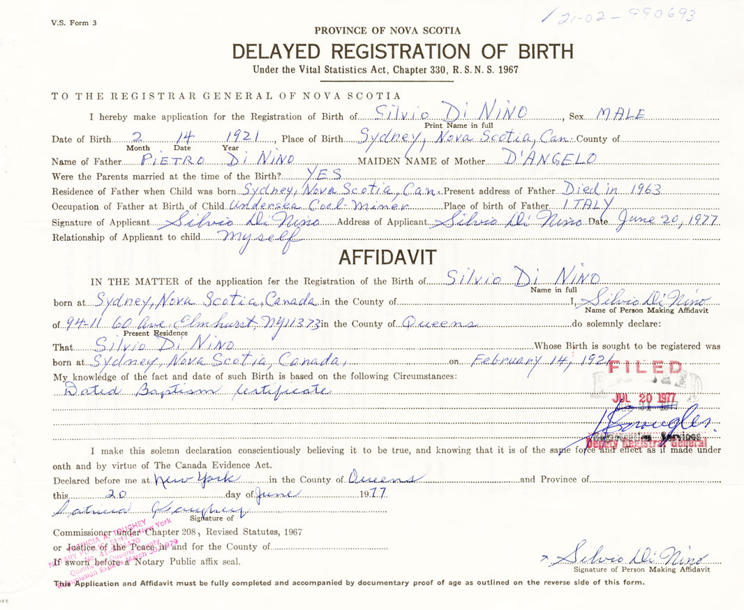 I hereby make application for the Registration of Birth of SilvioDi Nino Sex Male