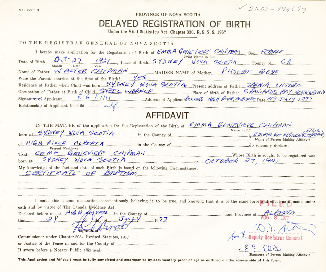 IN THE MATTER of the application for the Registration of the Birth of Emma GenevieveChipman