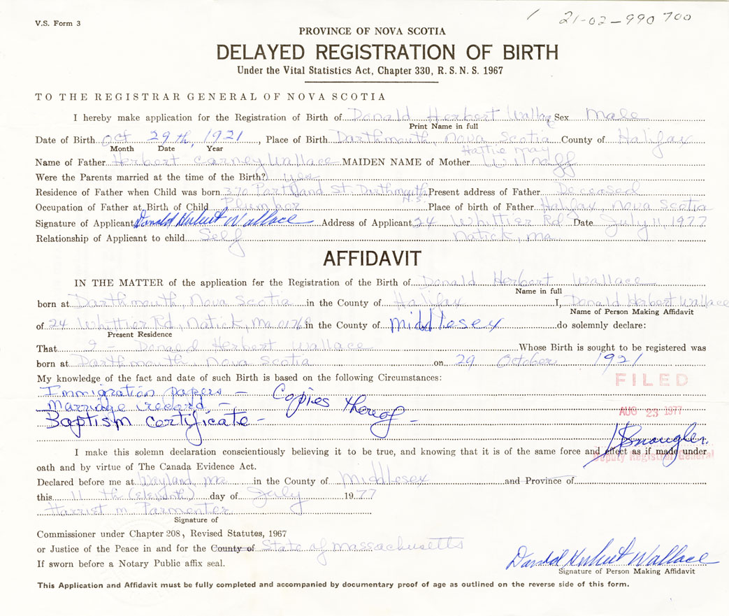 Date of Birth October 29, 1921 Place of Birth DartmouthCounty of Halifax