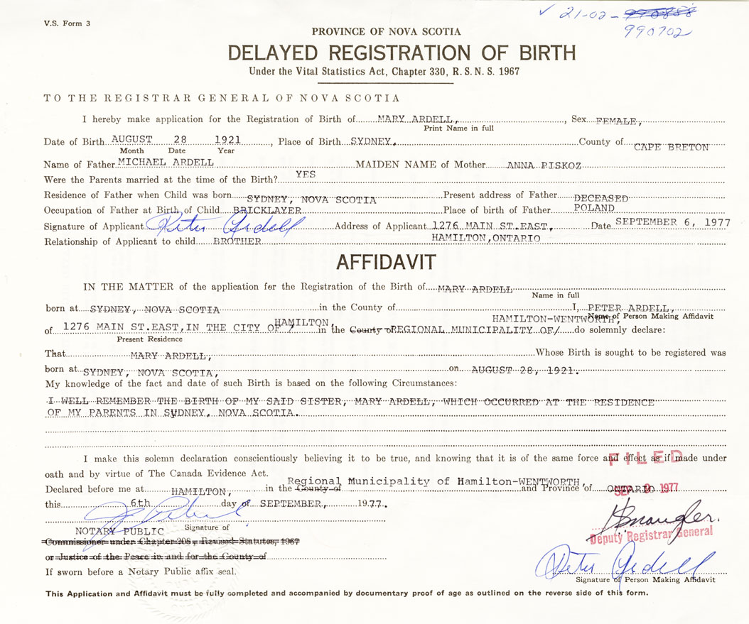 I well remember the birth of my said sister, Mary Ardell, which occurred at the residence of my parents in Sydney.