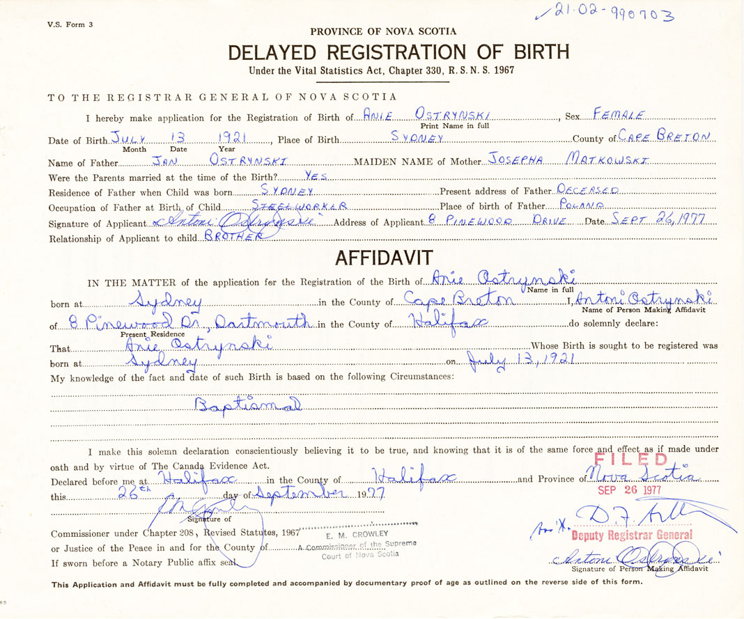 I hereby make application for the Registration of Birth of AnieOstrynski Sex Female