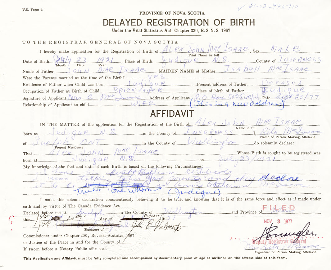 I hereby make application for the Registration of Birth of Alex JohnMacIsaac Sex Male