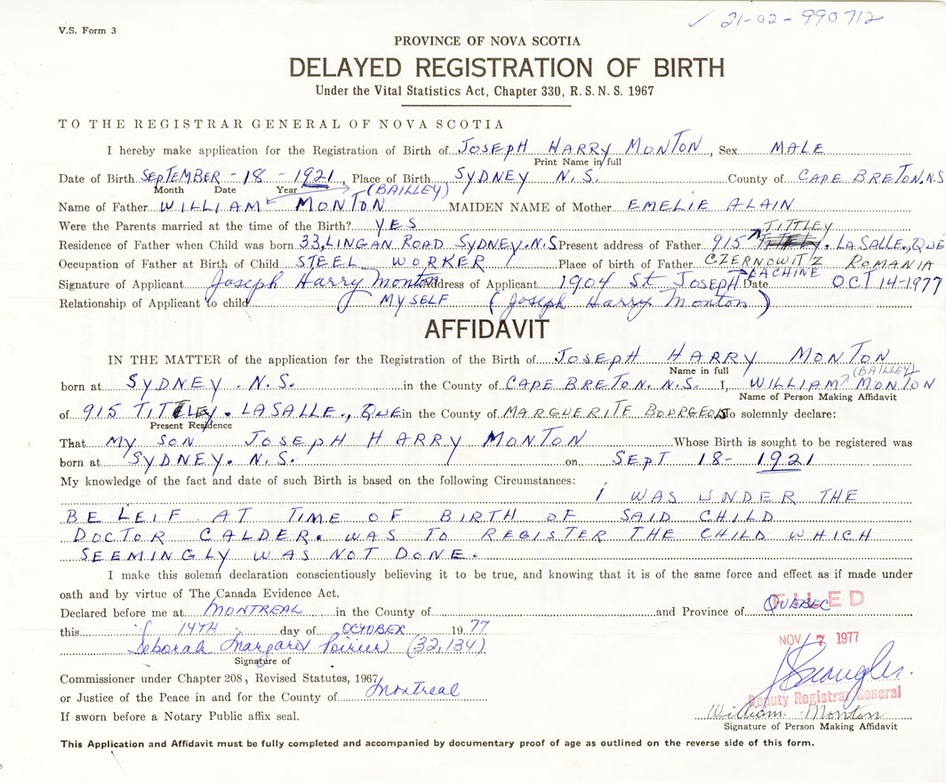 Signature of Applicant Joseph Harry monton Address of Applicant 1904 St. Joseph Lachine, Quebec Date October 14, 1977