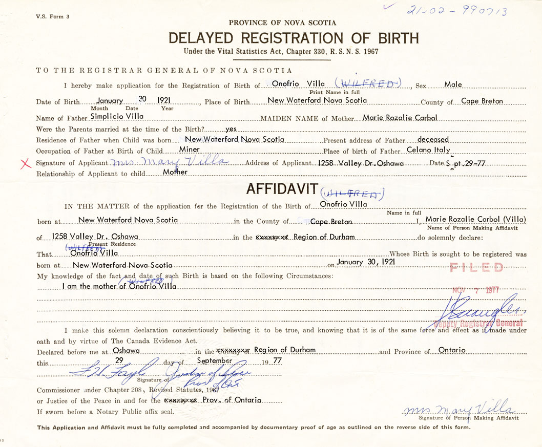 I hereby make application for the Registration of Birth of OnofrioVilla Sex Male