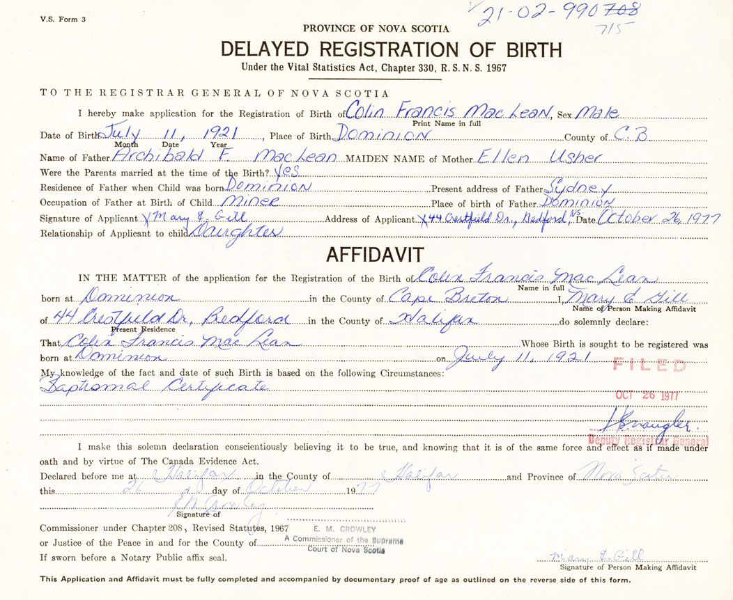 I hereby make application for the Registration of Birth of Colin FrancisMacLean Sex Male