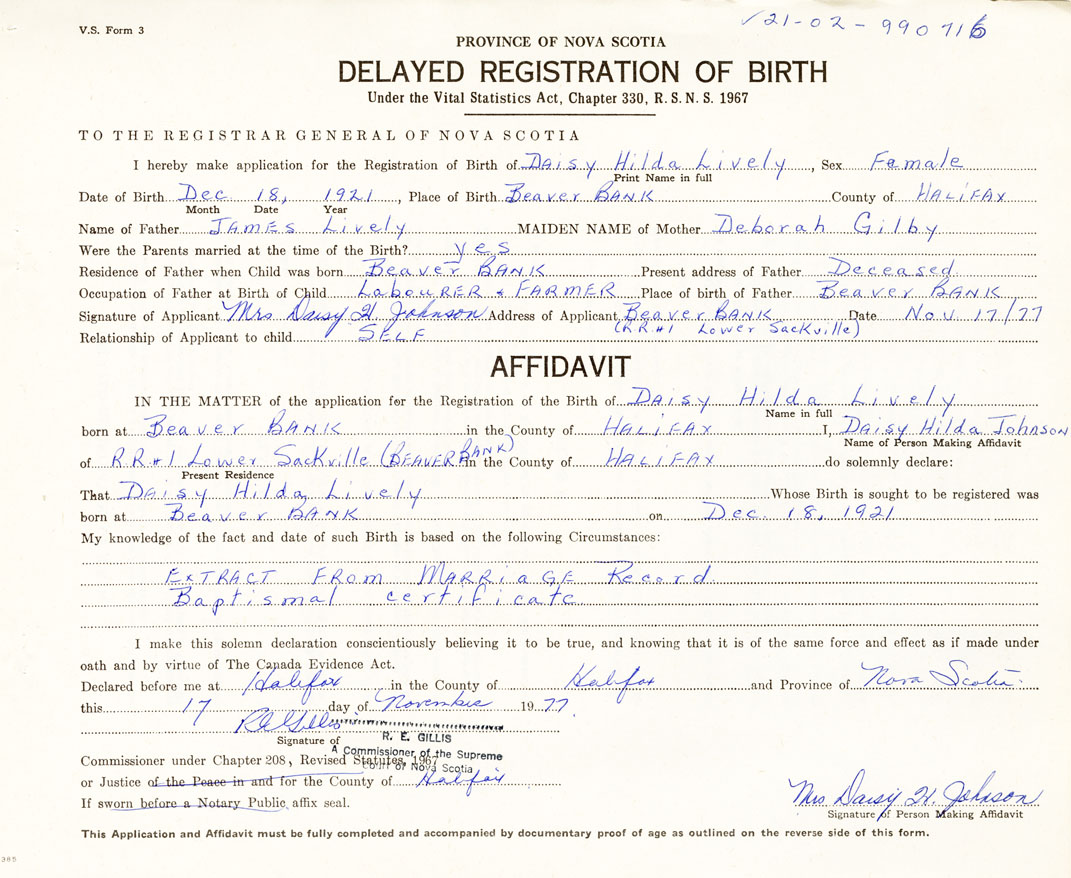 born at Beaver Bank Halifax County on December 18, 1921