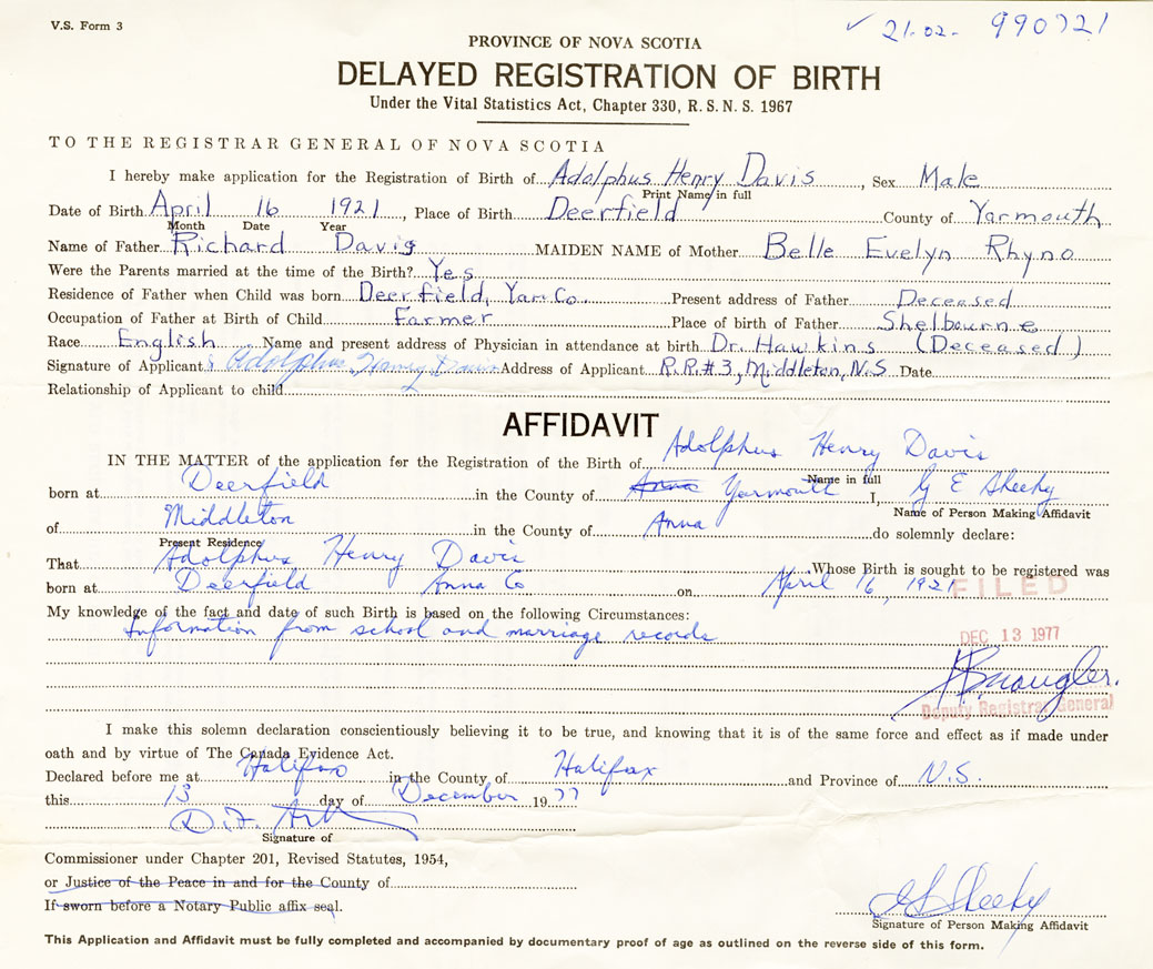 21. Name and Post Office address of Informant Adolphus Henry Davis RR3 Middleton