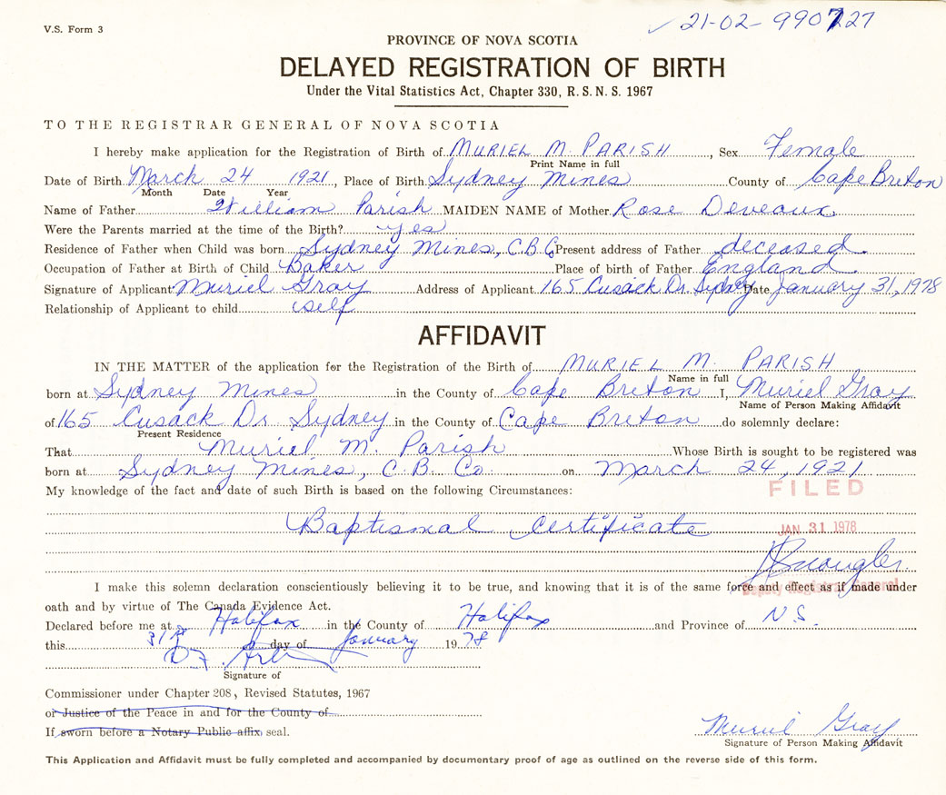 Date of Birth March 24, 1921 Place of Birth Sydney MinesCounty of Cape Breton