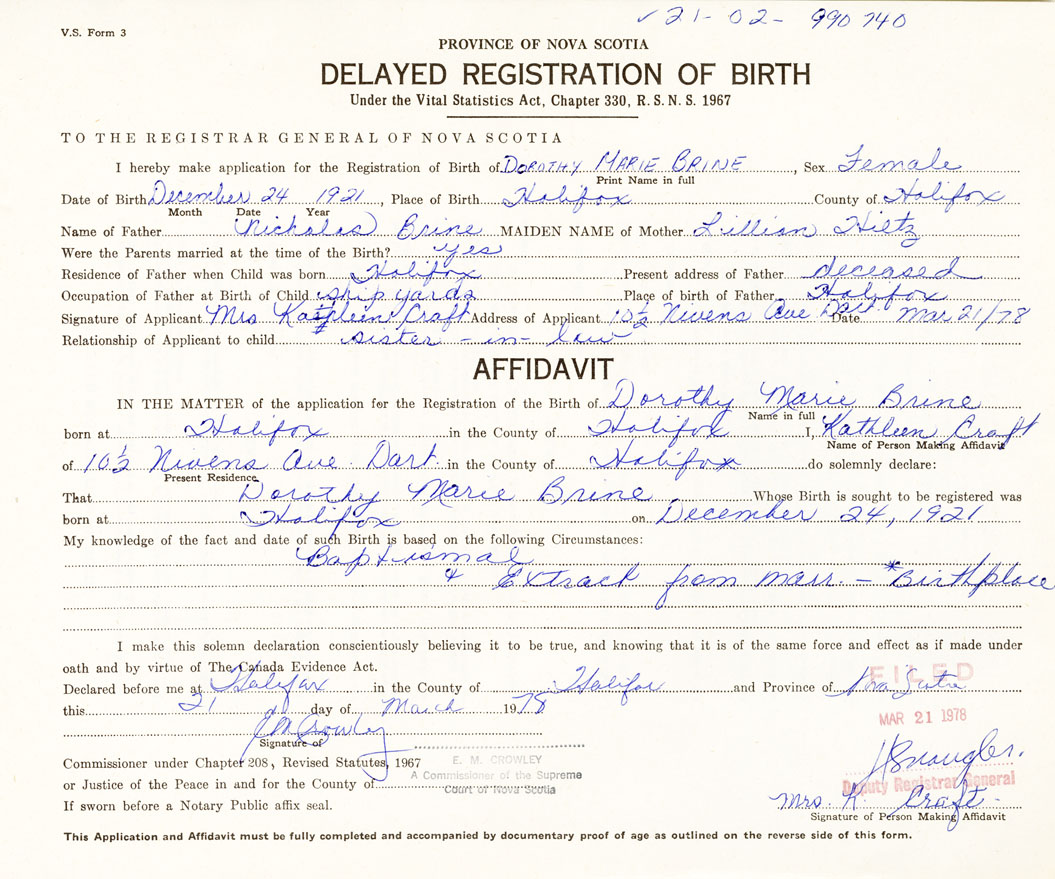 I hereby make application for the Registration of Birth of Dorothy MarieBrine Sex Female