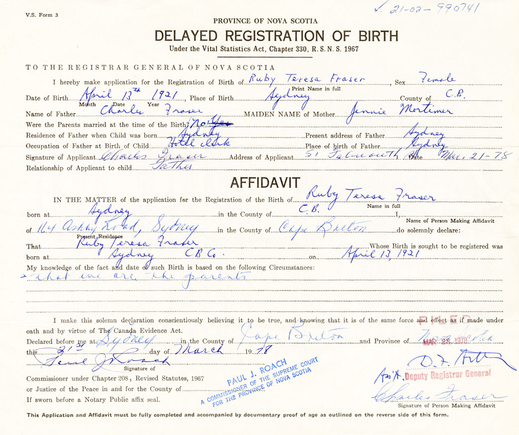 IN THE MATTER of the application for the Registration of the Birth of Ruby TeresaFraser