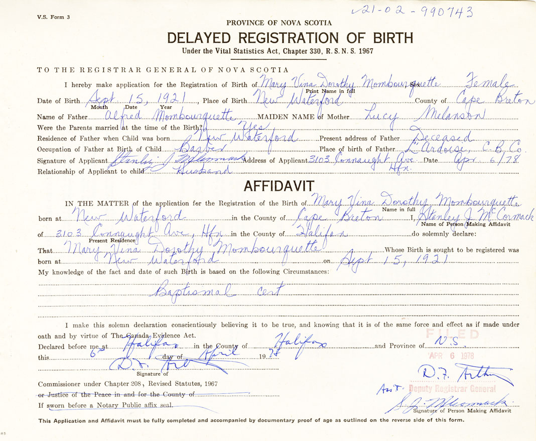 I hereby make application for the Registration of Birth of Mary Vina DorothyMombourquette Sex Female