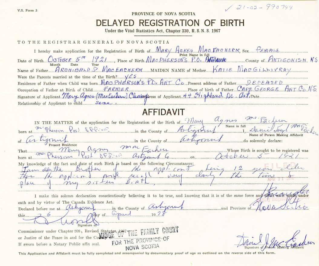 Date of Birth October 5, 1921 Place of Birth MacPhersonsCounty of Antigonish