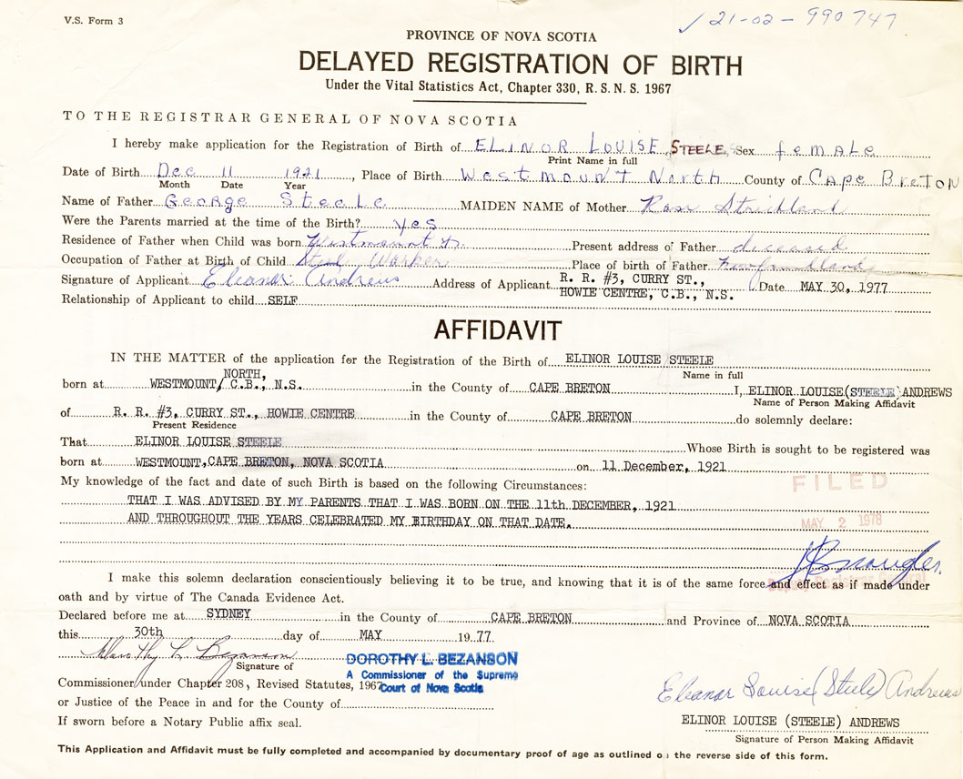 Date of Birth December 11, 1921 Place of Birth Westmount NorthCounty of Cape Breton