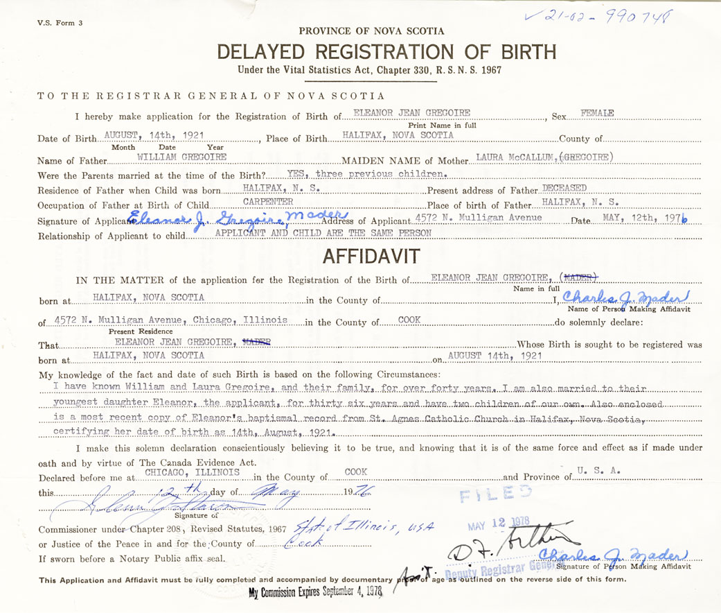 I have known William and Laura Gregoire, and their family, for over forty years. I am also married to their youngest daughter Eleanor, the applicant, for thirty six years and have two children of our own. Also enclosed is a most recent copy of Eleanors baptismal record from St. Agnes Catholic Church in Halifax, certifying her date of birth as 14th, August, 1921.